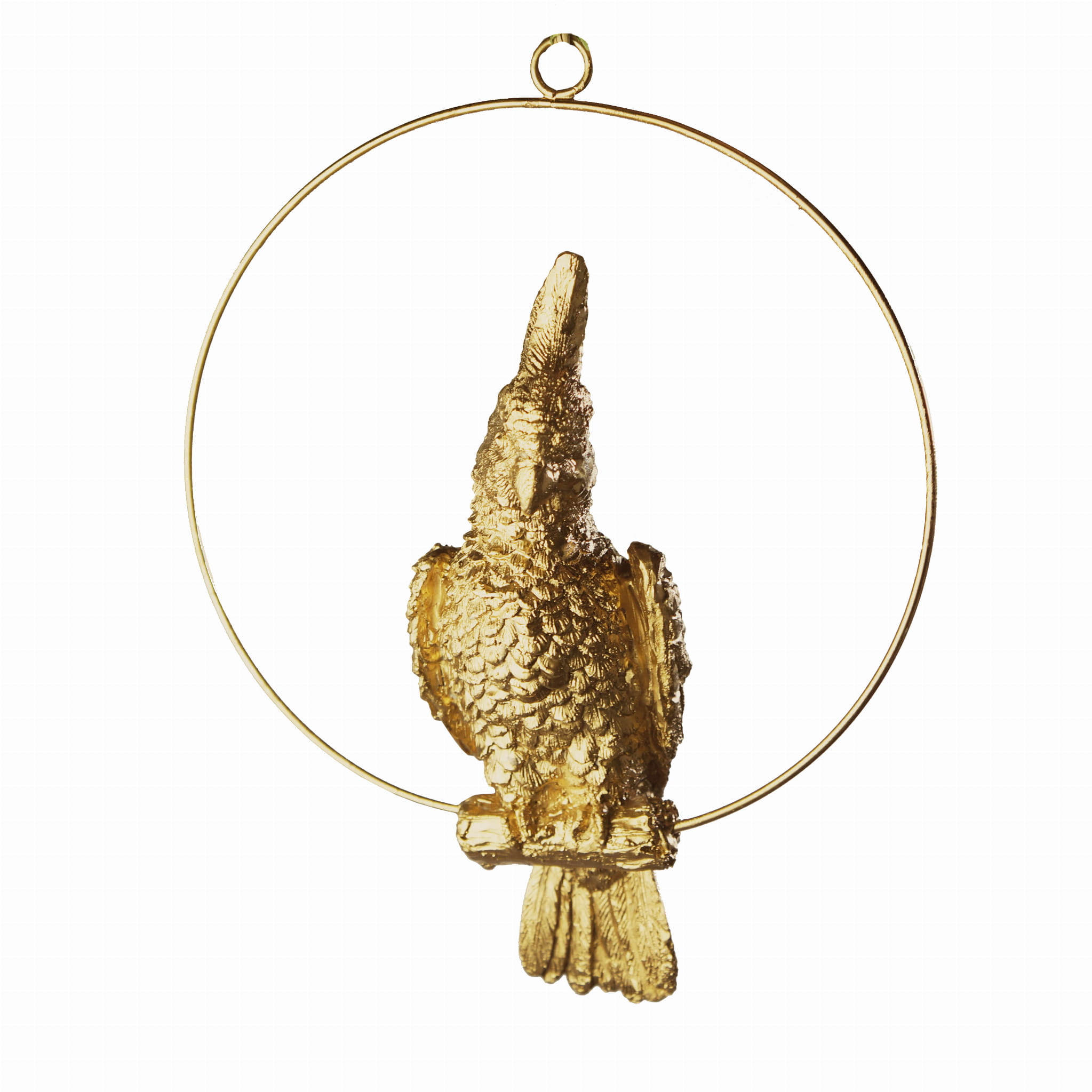 Figura S N°8 to urocza złota papuga, która siedzi na ozdobnej złotej obręczy. Ta piękna i oryginalna dekoracja wykonana jest z trwałej żywicy, która dodaje jej wyjątkowego uroku Twojej lampie.